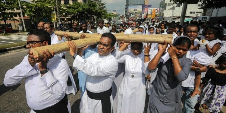 Sri Lankan priests and nuns carry the cross during Good Friday celebrations in Colombo (ANSA)