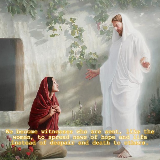 Jesus, too, comes to meet us on our way in our daily lives amid doubts, perplexity and fear. He comes to show us that He is truly risen and alive in the present with us. Seeing Him alive, we can let go of fear and be open to the newness that He brings. We become witnesses who are sent, like the women, to spread news of hope and life instead of despair and death to others. Let us meet Jesus on our way today and be sent as witnesses of new life and faith to our sisters and brothers.