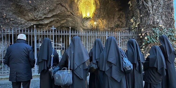 The nuns were accompanied by the Abbess of Santa Scholastica in Victoria. Upon their arrival at Mater Ecclesiae, they all visited the Lourdes Grotto in the Vatican Gardens to sing and pray before the statue of Our Lady, an identical copy of the effigy venerated in Massabielle.
