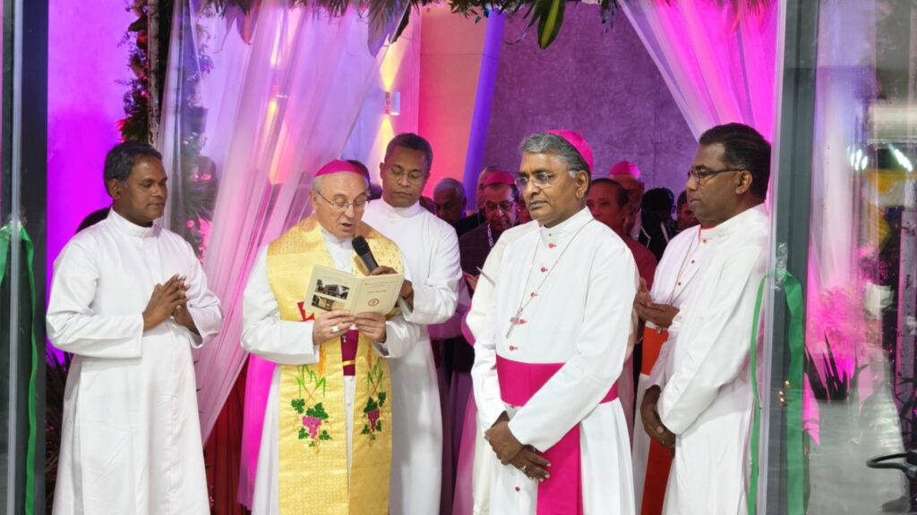 A brief felicitation program followed the blessing, presided over by Cardinal Ferrão. Archbishop Girelli delivered a felicitation message, while Archbishop Sebastian Durairaj, chairman of the CCBI Commission for Proclamation, and Bishop Ambrose Pitchaimuthu, director of the Pontifical Mission Organizations, also addressed the gathering.