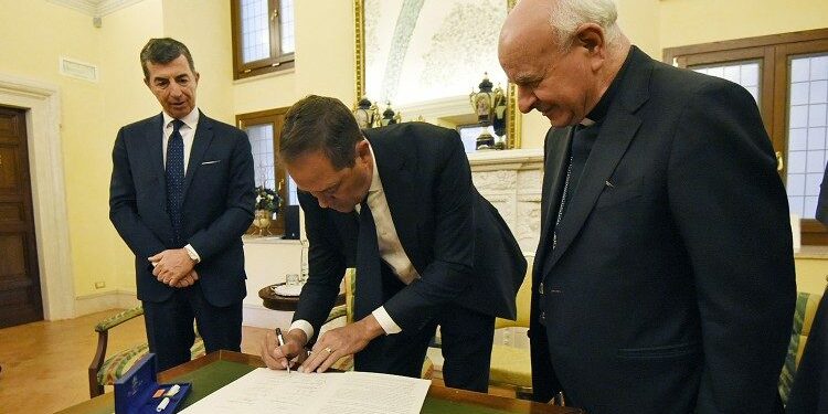 The signing ceremony in the Vatican followed the audience of Cisco CEO and President, Chuck Robbins and a delegation, with Pope Francis before the General Audience.