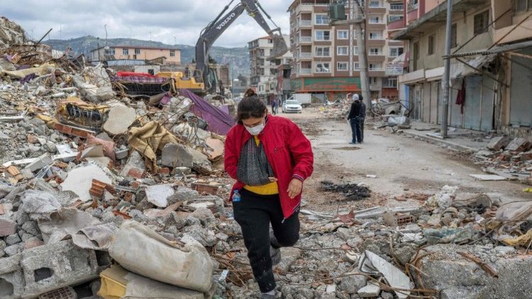 A woman walks on the rubble of a collapsed building in southeast Türkiye