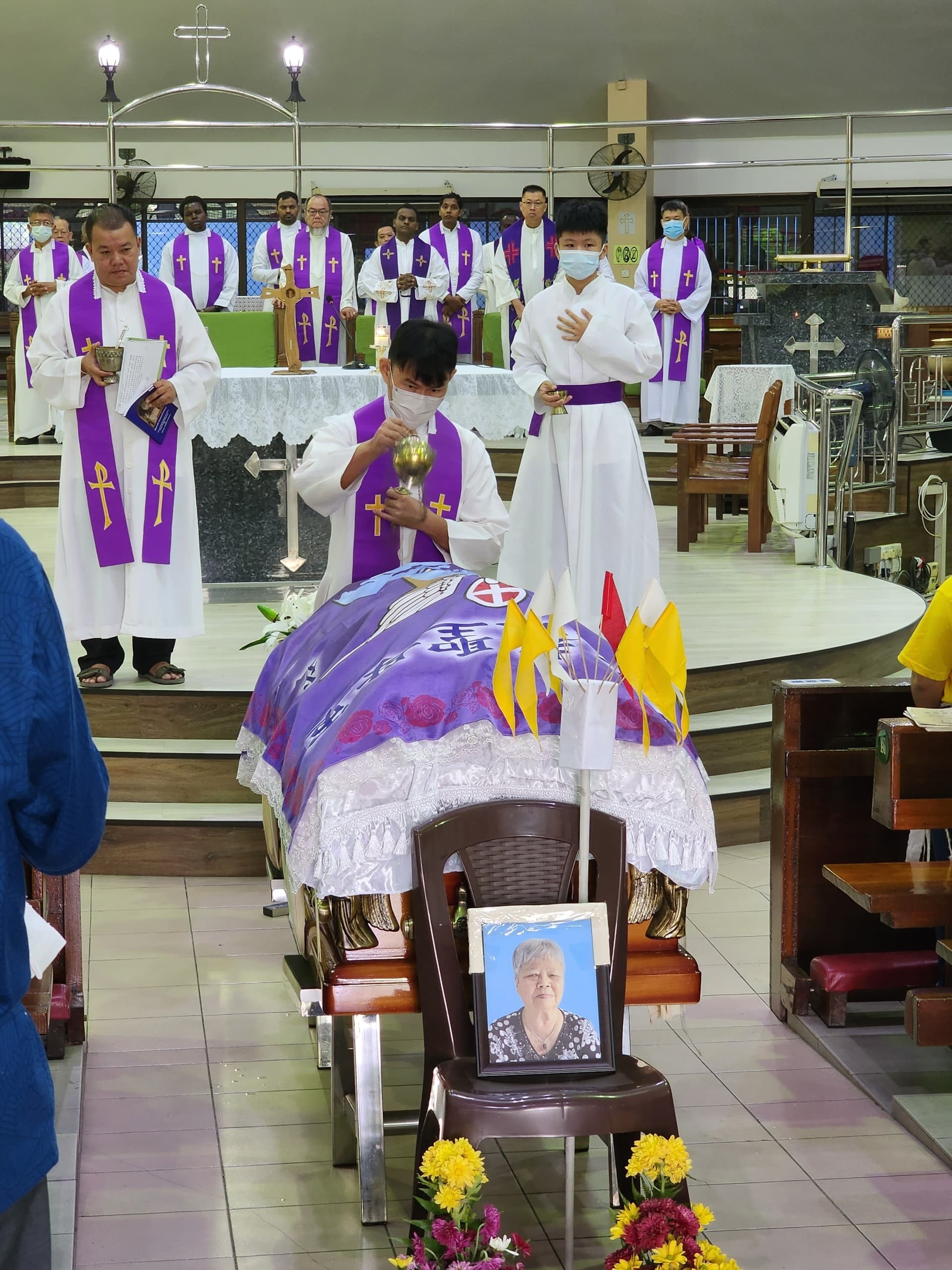 Fr Simon Lau during the Liturgy of the Funeral Mass of Catechist Helen Goh, looking on beside him is Fr David Ho