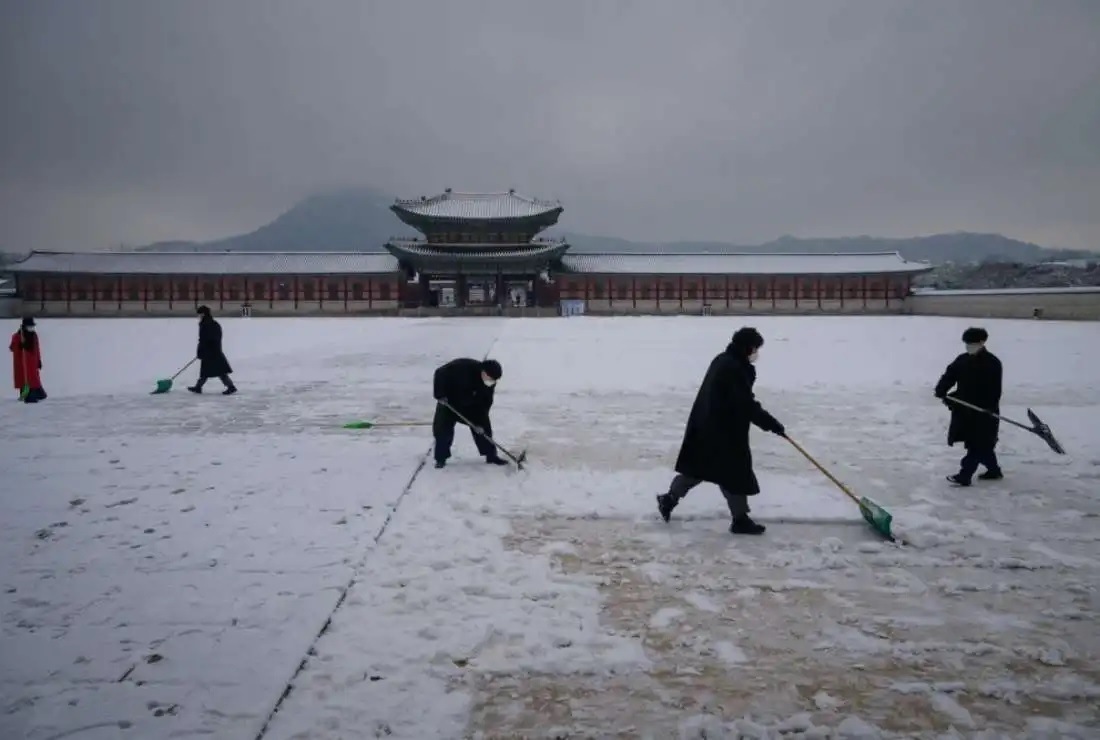 Workers clear snow at Gyeongbokgung palace in central Seoul on Jan. 28. South Korean government has launched a crackdown against undocumented migrant workers since last year. (Photo: Ed Jones/AFP)