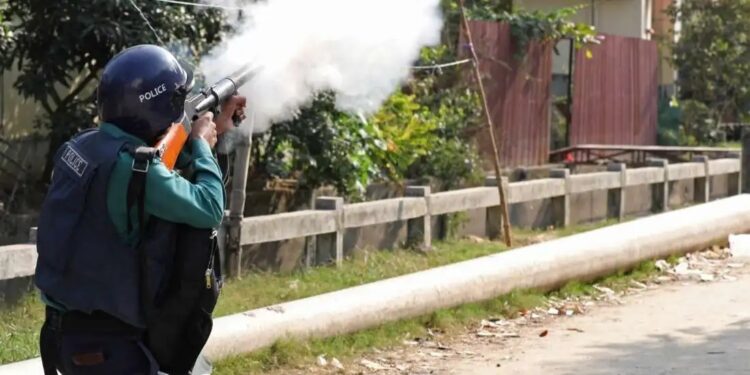 A policeman fires tear gas to disperse a mob on a street during a protest in Chittagong, Bangladesh, Jan. 7. (Photo: AFP)