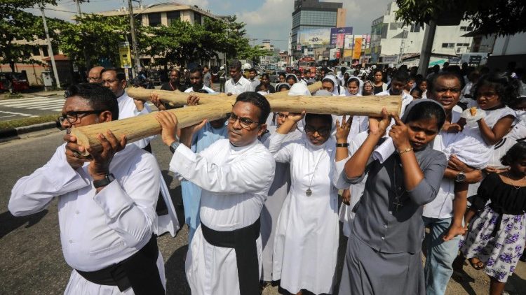 Sri Lankan priests and nuns carry the cross during Good Friday celebrations in Colombo (ANSA)