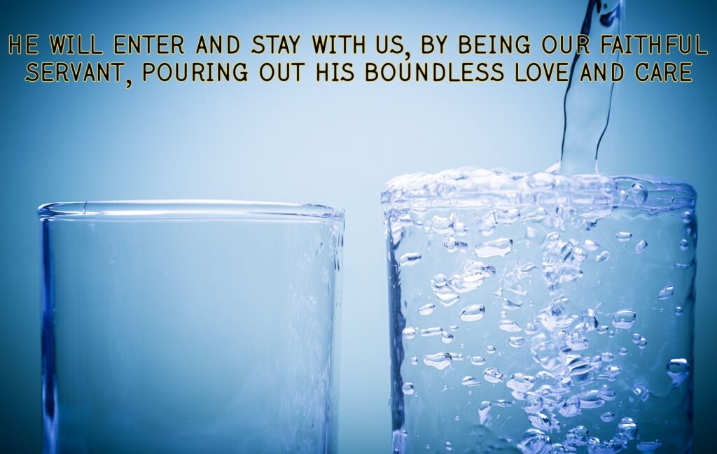 In the book of Revelation, Jesus says, “Behold, I stand at the door and knock. If anyone hears My voice and opens the door, I will come in to him and dine with him, and he with Me” (Revelation 3:20). Jesus patiently knocks at the door of our lives every day. If we choose to open the door, He will enter and stay with us, by being our faithful servant, pouring out His boundless love and care.