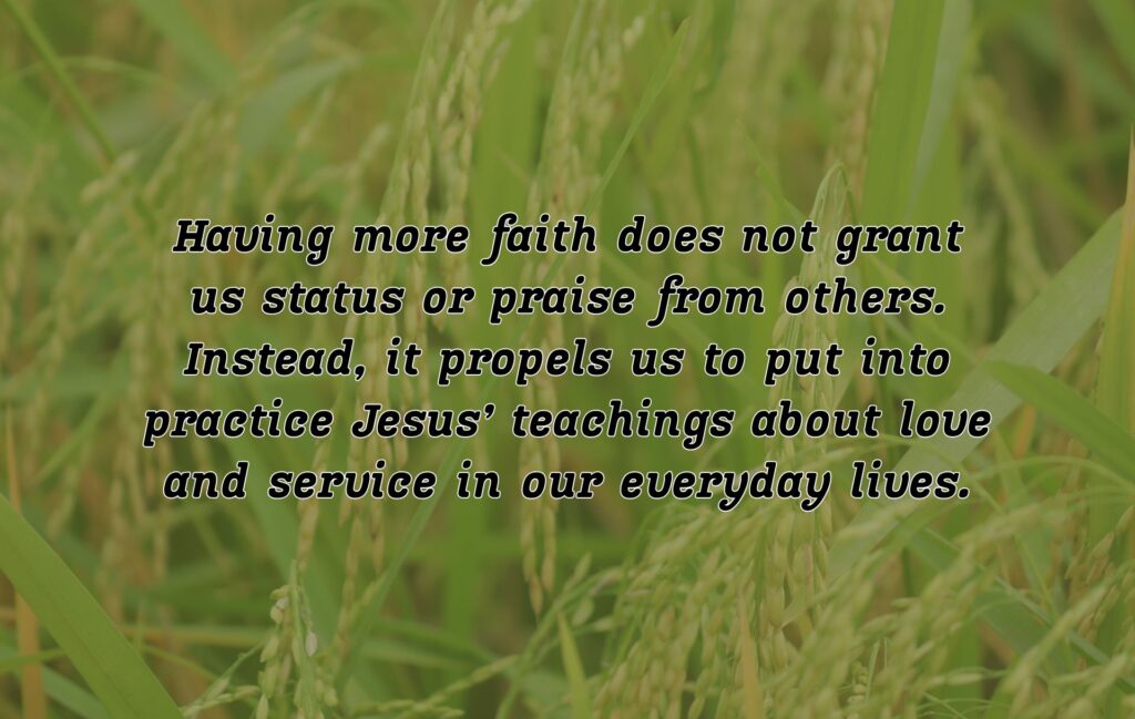 Having more faith does not grant us status or praise from others. Instead, it propels us to put into practice Jesus’ teachings about love and service in our everyday lives. Ultimately, how fulfilling it would be to approach Jesus, our Master, and humbly and joyfully say, “We are merely servants; we have done no more than our duty.” Even with faith as small as a mustard seed, we are called to follow Jesus by living a life of loving service, particularly towards the poor and vulnerable among us. The emphasis should not be on the size of our faith, but rather on how that faith—no matter how small—motivates us to serve others.