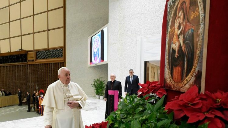 At the conclusion of the General Audience, Pope Francis asked everyone to remember in their thoughts and prayers war-torn Ukraine and the people living through “cruel suffering” there. He then stood in silence before a painting on display in the audience hall of the icon known as “Our Lady of the People”, venerated in Belarus and Ukraine, offering his prayers for peace and inviting everyone to join spiritually with him. – Vatican News