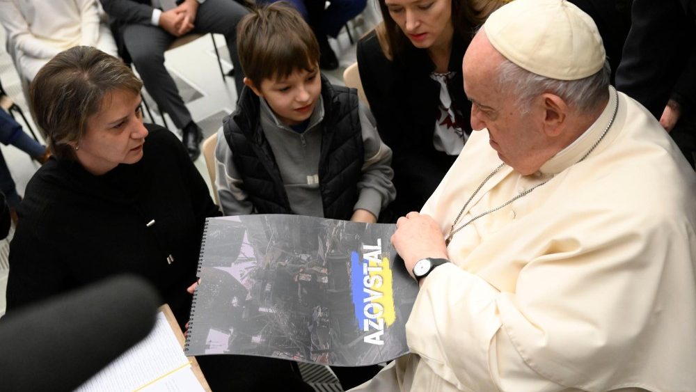 At the conclusion of Wednesday’s General Audience, Pope Francis greets a Ukrainian woman whose husband is a prisoner of war and their son, who came bearing gifts for the Pope, including a calendar showing the devastation of the Azovstal steelworks plant.