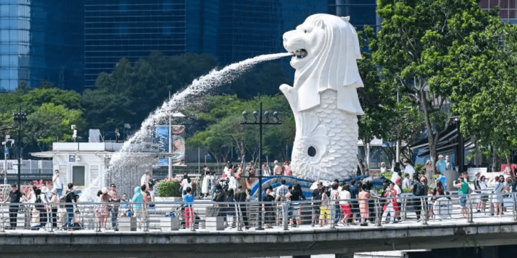 People gather for a photograph next to the Merlion statue at Marina Bay waterfront in Singapore on Mar 18, 2024 (Photo: AFP)