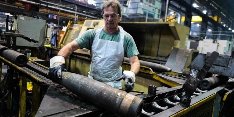 An employee handles 155mm caliber shells after being manufactured in Pennsylvania, US  (AFP or licensors)