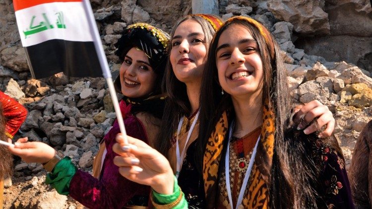 (file photo) Young women dressed in traditional clothing wave an Iraqi national flag during Pope Francis 2021 visit to Iraq  (AFP or licensors)