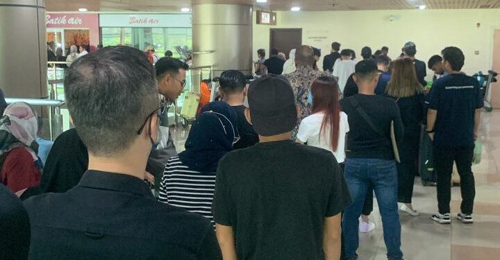 The long queue at the airport’s Batik Air office at Kuching Airport. (Photo by Lynette Tan)